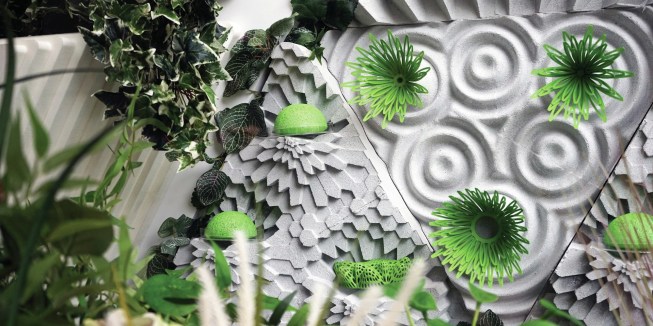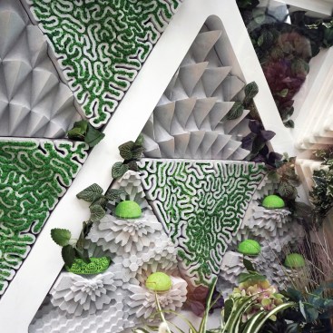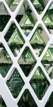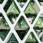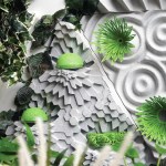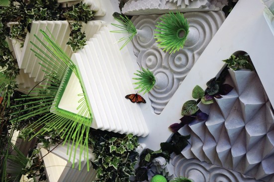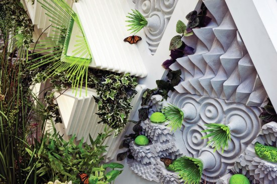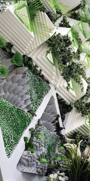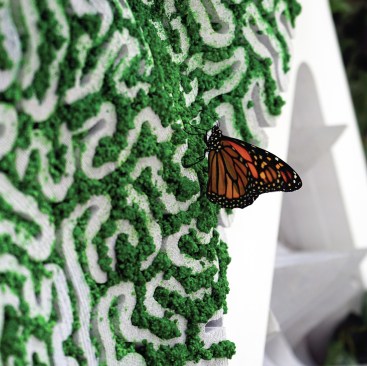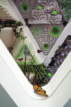 Other features of the project are equally in service of the insects. LED screens at the street level provide magnified live views of the caterpillars and butterflies in the vertical meadow, which also connects to a multi-story atrium adjacent to the circulation core. Interior partitions are constructed from mycelium, and additional planting at the ceiling enhances the interior atmosphere and building biome. Hovering around the building, a few butterfly-shaped drones take readings and maps of the immediate microclimate. They return every few minutes to recharge, and their combined real-time data works to maintain the butterfly health.