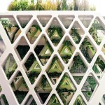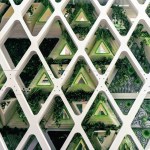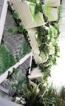 The double-skin street facade, with a diagrid structure infilled glass at the outer layer and with “pillows” of EFTE foil at the inner layer, encloses a careful climate – controlled space, 3’ deep and 7 stories tall. This “vertical meadow,” the terrarium proper, serves as an incubator and safe haven for Monarchs in all seasons. It contains suspended milkweed vines and flowering plants to nourish the butterflies at each stage of their life cycle. Hydrogel bubbles on the EFTE help maintain optimal humidity levels, and sacs of algae help purify the air and the building wastewater. Solar panels on the roof provide renewable energy to assist in the powering the facilities. Butterflies can come and go as they need from inside the building skin system and roof.