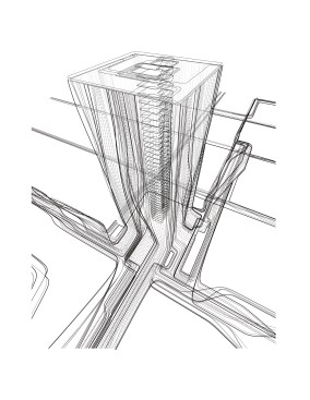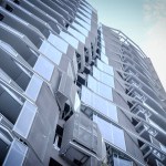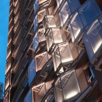 Our proposal utilizes subtle variations in the geometry of the exterior paneling and layering of material to create a scheme that is not based on repetition but still accommodates the needs of the client. We deployed a strategy of “pixilated lines” by applying a set of exterior paneling in varying materials and differing geometries to run along the façade of the building as a series of pixilated lines. We also deployed a system of incrementally shifting balconies in conjunction with the panels to add more depth to the facade. These “lines” of panels extend from the ground to the top floor to give the illusion of depth and movement as well as formal continuity to the overall project. These “lines” often split in order to change material and the voids between “lines” of panels to add depth to the reading of the façade. By shifting sections of fritted glass, expanded aluminum screen, solid panels, and steel structure, the buildup of these small differences create large variations in the façade of the building.
