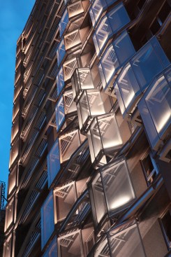 The building includes a carefully considered weaving of four materials: 1) expanded aluminum mesh, 2) fritted glass, 3) solid panel, and 4) steel structure. This is to disrupt the repetitious and occasionally quirky floor plans, while still allowing for views beyond and providing a sun shading system. The interplay between metal screens, glass, and solid panels is not merely aesthetic but it also performs functionally. This strategy simultaneously allows for natural light while reducing heat gain, provides privacy for rooms beyond, and it creates a buffer between the interior of the building adjacent elevated highway. And importantly, the exterior of the building communicates a more dynamic building- one that captures the spirit, scale, and multi-layered nature of the city.