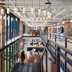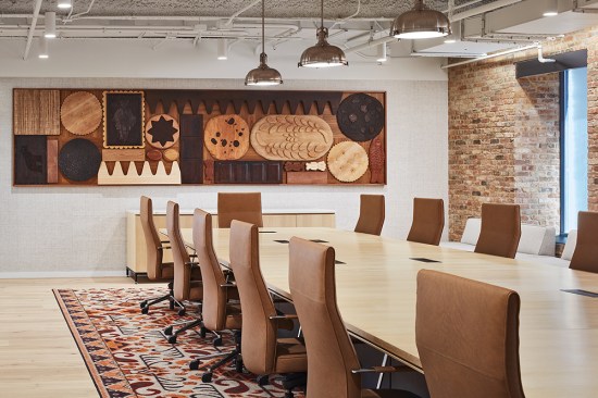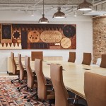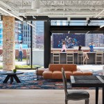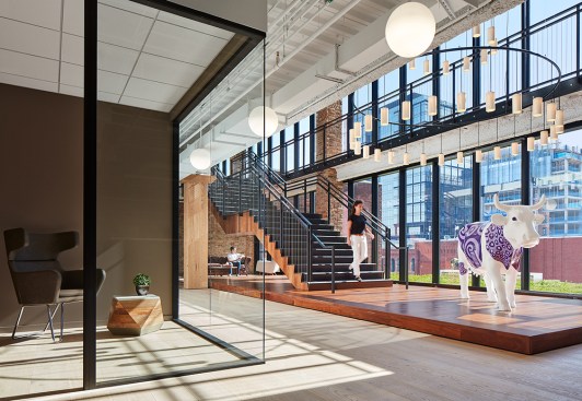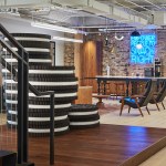Working closely with company leadership, SCB developed a new vision for Mondelez International’s headquarters; one that blends contemporary workplace design, authentically urban materials, and local artisanry. Visually, the space aligns with the company’s brand palette, but gestures towards the wabi-sabi design approach, embracing the ‘beautifully imperfect.’ Brick walls and columns, steel connecting stairs and accents, and wood ceilings are combined with lighthearted art installations and murals throughout the space, creating a unique, engaging, warm and playful