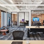 Spacious, flexible and interactive, the four-story open office is completely comprised of free address bench-style workstations, including those of the executive team and CEO. Complementing the open office are a variety of support spaces such as phone rooms and conference rooms, as well as informal meeting spaces and cafes to accommodate individual and group workstyles. A “Connect Zone” on the fifth floor provides staff with a company store, a communal kitchen, and large gathering area with a stage for all staff meetings and presentations. The “Connect Zone” opens to one of the office’s two large outdoor terraces, which offer additional opportunities for community building amongst staff.