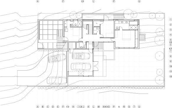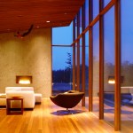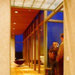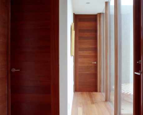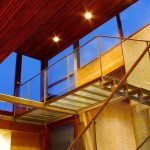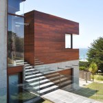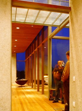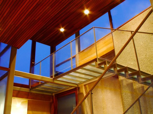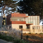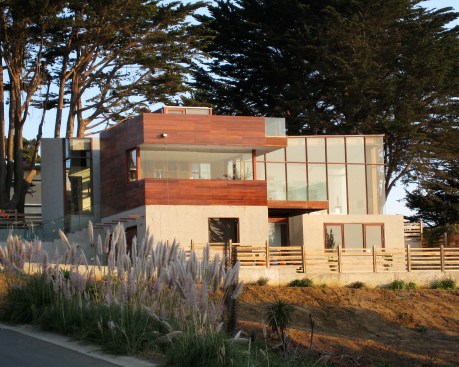Self-built by the owner’s family, this compact concrete house for an avid surfer overlooks the Pacific Ocean just south of San Francisco. Located on a small hillside site with stringent community zoning restrictions, the home’s roof gently contorts as a single curved plane to maximize light and view within the complex zoning envelope and community design restrictions. The frequently fogbound and chilly site required a sheltering form to provide pleasant indoor/outdoor living, as well as large expanses of privacy-filtered glazing to bring sunlight over the shoulder from the southeast-facing rear of the house. For simplicity of appearance and minimization of cost and resource consumption, the house is constructed of just two primary materials inside and out—bush-hammered, site-cast concrete, and sustainably-harvested Peruvian redwood imported and milled on site by the owners. The 12” thick concrete walls are cast monolithically with rigid foam insulation between two reinforced layers of concrete, affording a massive wall exposed inside and out. This two layer concrete wall system affords a robust, low-maintenance exterior, high insulation values, and excellent interior thermal mass. Windows, doors, flooring and millwork are hand built and finished by the owners on site. The main ceiling is an arcing plane of Peruvian redwood paneling warped down to follow the natural street slope at the front of the home—as required by local zoning—while warping back in the opposite direction at the rear of the home to minimize sunlight shadowing of the neighbor property —as also required by local zoning. This contradictory formal constraint creates the subtly dynamic warped form and interior space of the home. A glass clerestory box pierces this curving roof plane, creating a stairway, light and ventilation shaft through the center of the home, and providing access to a roof deck with concealed photo-voltaic and solar hot water equipment.