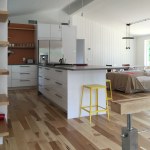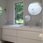 The material and color palate was kept simple. High gloss white cabinets were used throughout with white to light colored penny tiles in the bathrooms. The new wood floor on both floors of the house is Hickory, livening up the quite pallet.