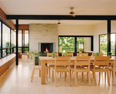 The exterior combines concrete landscape walls, red cedar-sided building walls, and banks of black-framed aluminum windows and doors. Inside, red-cedar accents and exposed structural steel provide definition in spaces whose primary finishes are bamboo flooring and white-painted drywall. The result is a house that is thoroughly at home in its surroundings and comfortable in its own style, a timeless Modernism that should wear very well. “It’s in kind of a 1950s vernacular,” noted one judge, “but still looks contemporary.”