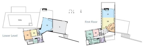 The building layers two roughly L-shaped plans, each divided into a public wing for living spaces and a private wing for bedrooms. Primary living spaces occupy the upper level, taking in treetop views of the water. By rotating the public wings 90 degrees from each other, Young created a sheltered outdoor living space at ground level, which serves as both an extension of the family room and a shaded refuge for the adjacent pool area.