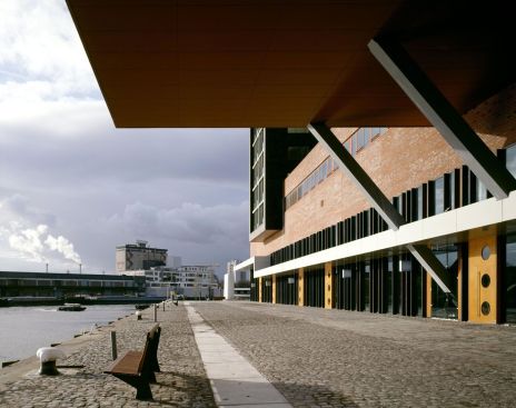 The Wilhelmina Pier is located next to a disused dock in Rotterdam, an area now home to residential and office towers. The pier was once a bridge to the new world, a place where ocean liners departed for America. In 1999, Mecanoo devised an urban concept for the south quay, which is mostly designated for residential development.