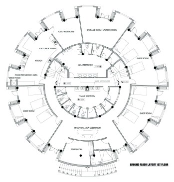 The first floor of the building is a residential area for visitors and ancillary services such as kitchen, storage, sanitary and bathing areas, And wall tiles decorated with chopped stone.