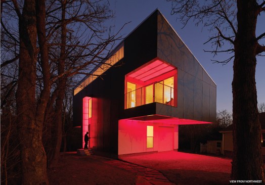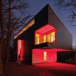 Mood Ring House is an exploration of how architecture can have different day and night presences with distinct experiential and spatial qualities. The “T” shaped volume of this inexpensive house, located in an eclectic neighborhood near the town center of Fayetteville, Arkansas, is born out of a mix of site limitations and opportunities, economic constraints, and programmatic requirements. With a skewed alignment to the lot lines, the siting preserves two established monumental trees, orienting the house to take advantage of north light from a clerestory, and south and west facing views of the immediate forest and the distant mountains, all while fronting the main intersection near the property. A live-work space, the house consolidates work functions on the ground, with a majority of living spaces above. The small base aids in reducing the footprint, preserving existing trees, and reducing foundation costs, which are at a premium in unstable Arkansas soil. The cantilevering upper level, in concert with the dramatically sloping site, gives views to the living spaces while creating a private enclave amidst the tree canopy. Beneath overhangs are a carport on the west facing front and an outdoor room on the east facing rear. The shed roof, open to the north, when coupled with an inverted truss profile, flood the interior volume with natural light. At night, illuminated soffits construct volumes out of projecting colored light from concealed LED fixtures. Colors are derived either automatically from the temperament of the house or directly by owners’ desire.