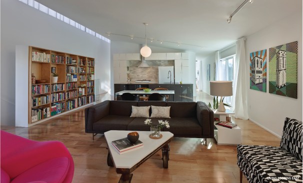 To keep costs down, the house is constructed primarily of generic, off-the-shelf materials, detailed to mask their humble character. The exterior envelope is primarily prefinished Hardi Panel and twin-wall polycarbonate. Panels were used in nominal dimensions (4×12, 4×10, and 4×8, respectively) to minimize labor costs during installation. Reglets between panels are inexpensive roof trim, powder coated to match the siding finish. Roofing is metal galvalume. The upper level windows are sliding patio doors and sidelights with interior steel and chain link railings. Cantilevers are accomplished with continual LVLs and engineered joists spanning between. The symmetrical balance of the cantilevers, and the relatively limited amount of openings, effectively turn the upper level into a box beam, allowing the unique floating form to be accomplished economically. Interiors are articulated and finished to enhance the expansive and overlapping relationship between spaces. A limited palette of whites and light woods are carried throughout the interior. Details throughout leave corners open to imply interlocking spatial relationships.