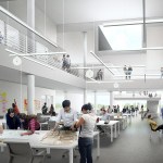 Michael Maltzan, founder and principal of Michael Maltzan Architecture, said, “The interior of the Moody is designed to foster a sense of openness and possibility. The double-height makers’ space at its heart can be imagined as an interior quad, echoing the other quads found throughout the Rice campus. This interior landscape brings the most diverse programmatic functions into contact with one another, while opening views out to the campus. This emphasis on transparency extends to the building’s exterior, whose brick-clad upper story seems to float over an entry level encased in floor-to-ceiling glass. With pedestrian paths cutting across the site’s open lawn and into the building, a set of stairs on the north façade turning back to form an interior amphitheater, and the cantilevered mass of the second story creating covered walkways below, the Moody will be one of the most active social spaces on the Rice campus, and a welcoming facility for all of Houston.”