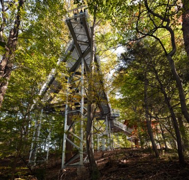 Metcalfe worked with Morris Arboretum to craft a unique treetop experience – a place to learn from nature. The exhibit extends along 450 feet of elevated pathways within the arboretum’s forest. Our design balances perceived danger, actual safety, beautiful materials, and real trees. A visitor favorite is the “Squirrel Scramble,” an open-net climb suspended 50 feet above the ground where visitors can play and lounge in the forest canopy.