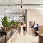 This take on activity-based-working, prioritizes privacy as a way of re-humanizing the office. Visual and acoustic privacy are provided holistically first and foremost by architectural solutions which are complemented with mobile elements such as custom-recycled ceiling panels and desk dividers.