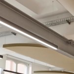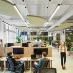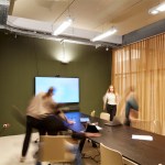 STUDIO VALE had the opportunity to step into the demolition of the previous tenants fit-out to safeguard on-site resources. An example is the careful demounting of acoustic baffles, which were repurposed into modular hanging acoustic panels covered in green textile.