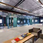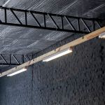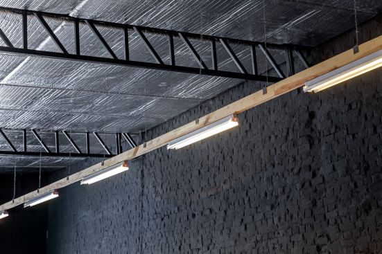 The main access to the office structure has been planned through an exaggerated ramp that leads to an expansive layout to accommodate the multipurpose workshop. Functional add-ons to the space include an industrial grade screed floor finish, lit by three long rows of light fixtures of industrial âbox typeâ that are mounted on timber batons running along the longer span.