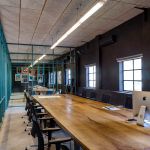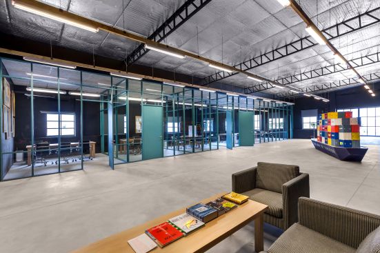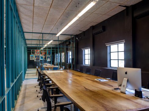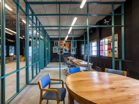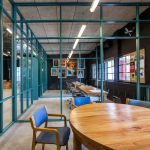 The corporate office is located in an existing old warehouse, a former rice granary in Gurgaon, Haryana, expanding over an area of 3000 sq ft in accordance with the clientâs brief. The design process started with the clientâs vision of an office characterized to be a multipurpose workshop to support the companyâs creative work and braced by spaces for cabins, meeting areas, work spaces, etc. The preservational angle demanded a straight-forward layout and retention of industrial aesthetics with minimal structural damage – a frugal yet sophisticated outlook. The entire vision formed the requirements to be crafted within the existing structure with brick masonry walls and piers holding a sloping flat-truss system surfaced by asbestos. With respect to site surroundings, the north and west were blocked by adjacent warehouses while the remaining sides stayed open. This led to an increase in sizes of existing doors and windows and also addition of new ones to augment the natural daylight spreading out across spatially.