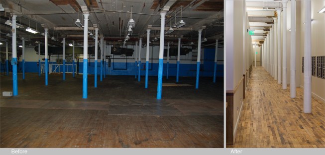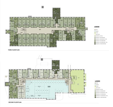 The residential units are uniquely varied based on their location within the mill. The first two levels which wrap the garage are primarily one-bedroom and studio units that alternate to allow all columns and beams to be exposed within the units. The third floor units take advantage of the full depth of the mill above the garage and are primarily duplex lofts extending up into the exposed heavy timber trusses of the roof. Inverted duplex units at the very top consist of sky lit bedrooms in the attic below living areas in the all-glazed clerestory.