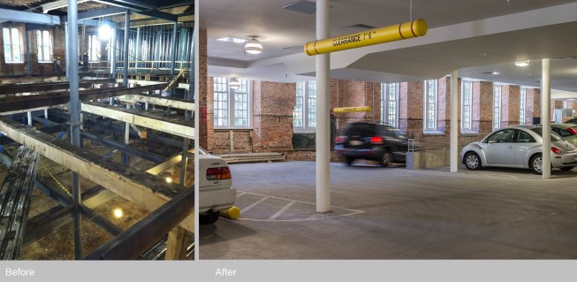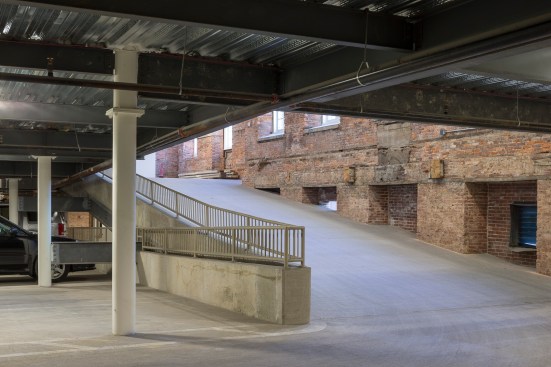 With no available exterior options, parking within the building was complicated by inefficient existing column spacing and high floor to floor heights. The solution inserts a multi-level garage creating three levels where there was only two. A new structural grid based on efficient horizontal and vertical parking dimensions was interlaced within the historical structure up to the transfer level, with the historic fabric then removed to create the volume for the garage