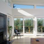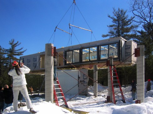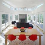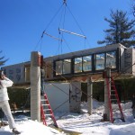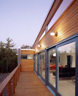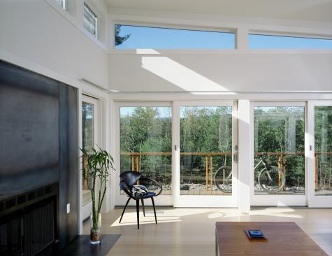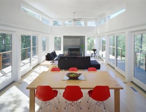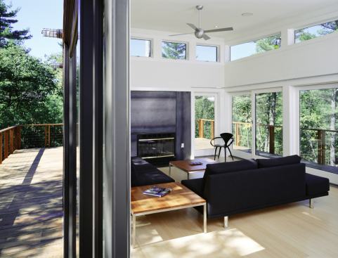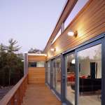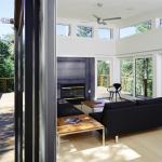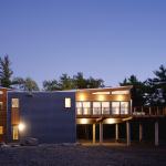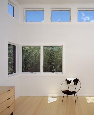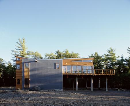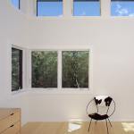 Located on a five-acre rocky outcrop, The Mountain Retreat trades-in overwhelming city skyscrapers and the scuttle of yellow cabs for sweeping views of the Catskill Mountains and hawks gliding over the thermals below. The client, who loves mountain biking and rock climbing, had camped out on the hilltop during the siting of the house to determine the best spot, angle and orientation for his new escape. The resulting artifact is a retreat carefully crafted into its unique surroundings. The Mountain Retreat amiably provides an efficient 1,800 sf indoor and outdoor living and entertaining experience. The finished house, sitting partially on concrete stilts, gives way to a striking display. Its angular lines, soaring height, and unique blend of warm cedar siding with cool gray concrete panels and glass are displayed to great advantage in the context of its rough mountaintop setting. The stilts act as supports for the great room above and, below, define the parking spaces for an uncluttered entry and carport. An enclosed staircase runs along the north side of the house. Clad inside and out in grey cement board panels, the stair leads from the ground floor entrance to the main living spaces, which exist peacefully as if situated upon the treetops. Requiring the insertion of pylons, well, and a septic tank, the rocky terrain of the immediate site had to be blasted away. Rather than discarding the remnants, the rocks were scattered about in masses around the site. Used for outdoor seating and the entry pathway, the initiative further emphasizes the relation and integration of the house into the natural backdrop. The home’s butterfly roof channels rainwater to two stainless-steel scuppers, from which it cascades off into in a waterfall effect upon thoughtfully placed boulders. The butterfly roofs on both ends, also gives the master bedroom a tall, sloped ceiling with allowance for the entry of an abundance of light from above, while a suite of ground-room floors fit cozily below. An elevated cedar deck wraps around three sides of the great room, offering a full day of sunshine for deck lounging and for the entire room to be opened to the outdoors with ease. Plain white cotton duck curtains on exposed stainless-steel tracks were designed along the three walls to give the client the ability to maintain any level of personal privacy and protection from the sun as desired. Throughout the house, sustainable, engineered bamboo floors were employed. Preserved with whitewash, they add a durable, yet softening touch to an already airy, open space. The predominantly light-hued interior is dramatically interrupted by dark countertops, and the dark cement board panels proceed as an accent to both the inside and out.