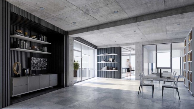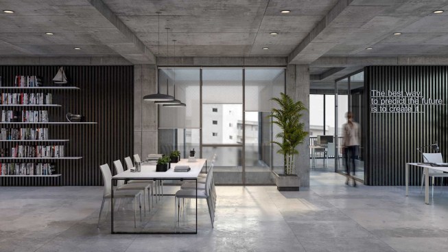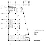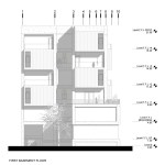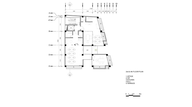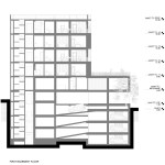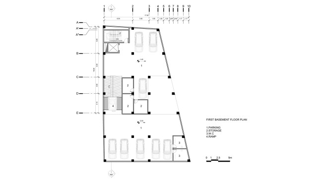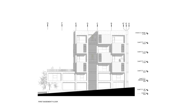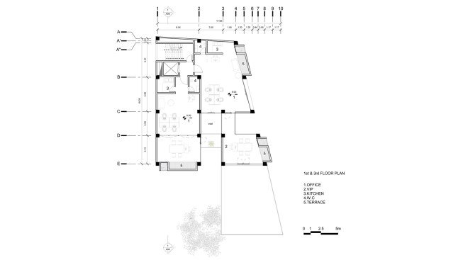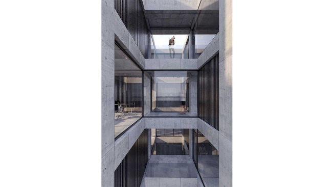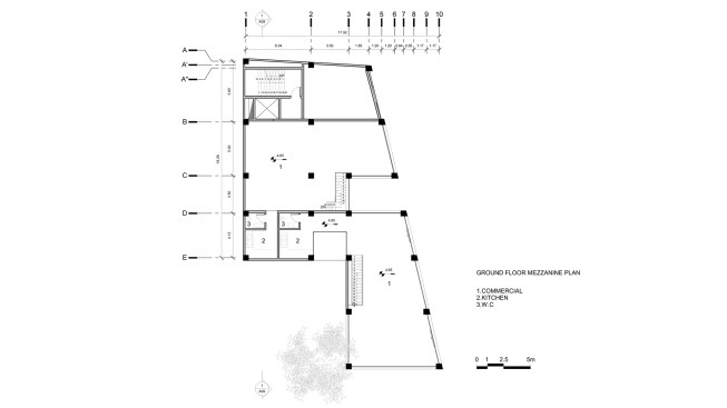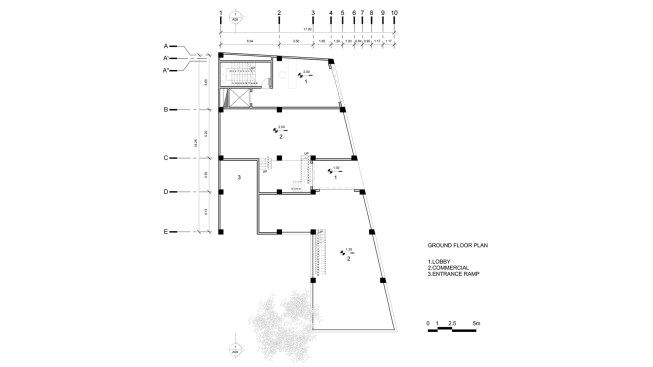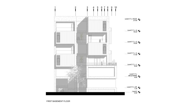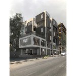 office units. In each story one unit has this space. So instead of two types of office units we have designed four types of office units. Due to more connectivity between city and building we expanded the event space on ground. Another issue of the project, was provision of parking, which the location of the existing old tree and uneven shape of the site made it more difficult. It was impossible to design a common parking lot. As a result, we divided the parking stories into a half story that would preserve the old tree in addition to provide the parking needed. In order to minimize the cost of construction, we have come to make the structural grid as the final finished surface. The structure of the project is a concrete frame, and through out of these frames a number of cubic volumes protrude into the 80cm width of the console which its material differs from the neutral surface of the concrete.