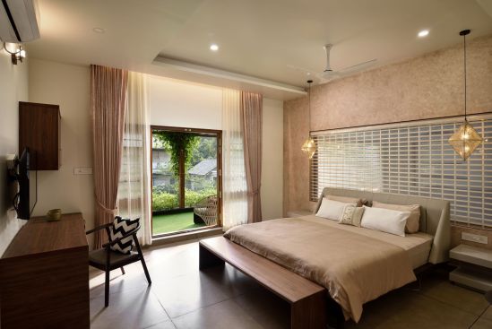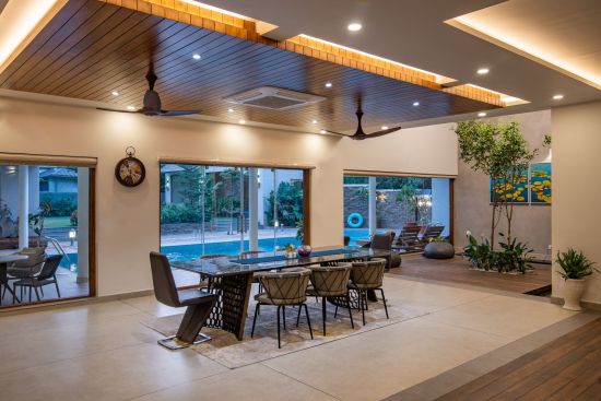 Beyond the formal zone, the volume of the house doubles to reflect the sentiment of the family, ensuring an open and welcoming space. A visual connectivity is maintained from the core to the fringes of the house. The skylight and the large voids create a naturally lit interior, with framed views. The kitchen and utility zone occupies the east while the western periphery is solely dedicated for bedrooms. Thus the private spaces form a secluded cluster towards an end of the site, with an exclusive verandah or balcony for personal space. The large overhang towards the south cuts off the scorching sun, securing the transparent skin from transferring heat inside. The swimming pool, gym and play area are zoned towards the south of the ground floor and the east of the first floor. In the first floor, the passage acts as a floating bridge, visually accessible to the ground floor and physically connecting the 4 bedrooms, lift, home theatre and the recreational area upstairs. The recreational area is basically an adaptation of an attic space beneath the pitched roof. The home theatre opens to a terrace garden, which is a part of the front facade, adding greenery to the earthy colour palate. The architecture style resonates with the tropical modern architecture, with a simple L- shaped sloping roof apt for the monsoon climate, hosting the vast volume inside without making it obvious on the outside. The occasional curves in the plan as well as in certain elements like the organic stair, is inspired from the protruded curve of the site.