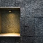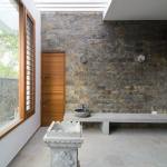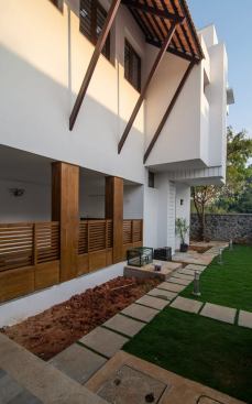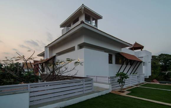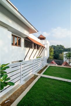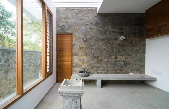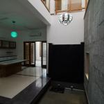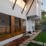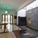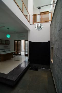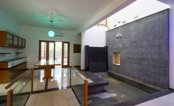 Fairly large house with an exclusive living space surrounded by an internal water court, Isolated large pooja / meditation space with a large view towards wild greenery on the rear side. Island kitchen with 2 side nature views serving a dining with a pebble topped glass dining table to accommodate 8-10 people, A Home theatre at the mid landing with a free floating terrace for the people who want to chill out connected to a large grass terrace above the car park are some of the interesting features adopted in the project.