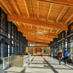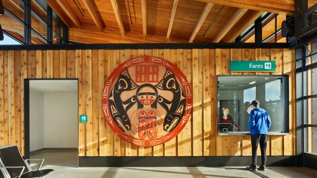 With its rectilinear mass evoking the form of a traditional longhouse, the cedar-clad terminal opens with a sunlit waiting room that features expansive shoreline views and gleaming display cases of artifacts and Coast Salish artworks. Thanks to intuitive wayfinding, travelers move easily through the building, which secures 40% of its electrical needs via a photovoltaic array on the roof. LMN’s design team also paired ample vehicle accommodation with a pedestrian pathway into downtown Mukilteo, maximizing the terminal’s accessibility for locals and visitors alike.