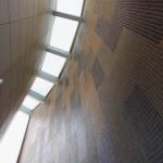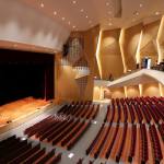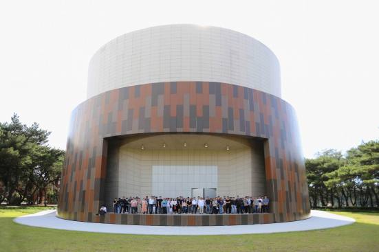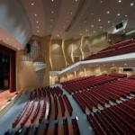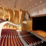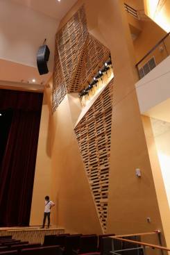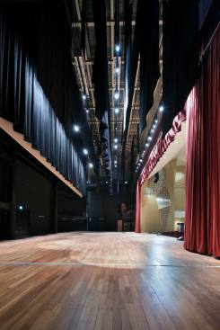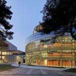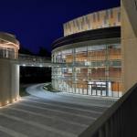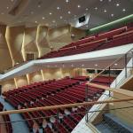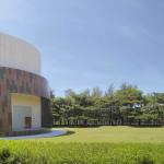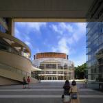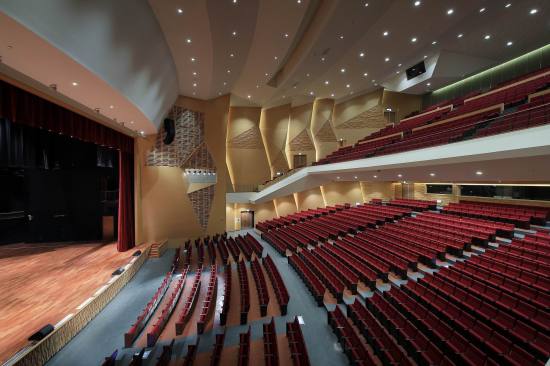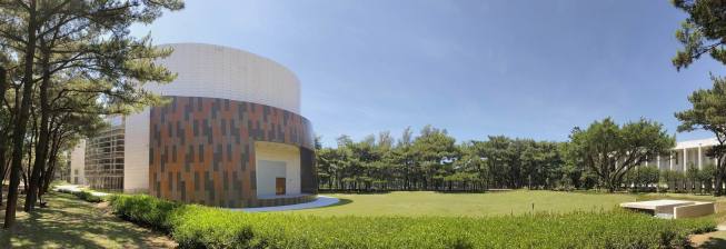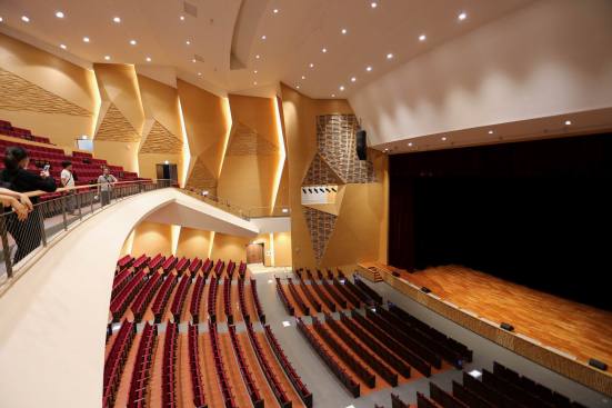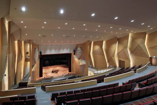 The auditorium is located on the central axis of the campus and is surrounded by a vibrant pine forest. The design concept is based on the image of pine cones, which is used as inspiration for the gradual unfolding of spatial hierarchies that connote roundness and grace. The architectural expression with different textures create various acoustical reflections, which means the auditorium can be used for musical and theatrical performances, assemblies, and other activities. The stage can accommodate nearly a hundred musicians for large-scale orchestra performances. Furthermore, sound reflectors can be strategically employed to enhance the sound of each vocal group. When the auditorium is switched to the lecture or assembly mode, the rear projection setting of the podium can reduce the glare of the audience’s line of sight. Unique amongst large auditoriums, the stage can be utilized as the backstage for outdoor performances, where the audience enjoy the performance from the sloped grass slope in the rear of the building. The auditorium, which can accommodate 1,600 people, is connected through an entry plaza, foyer, art gallery, sky corridor, indoor/outdoor auditorium, to the rest of the complex and campus beyond.