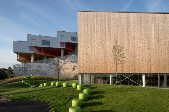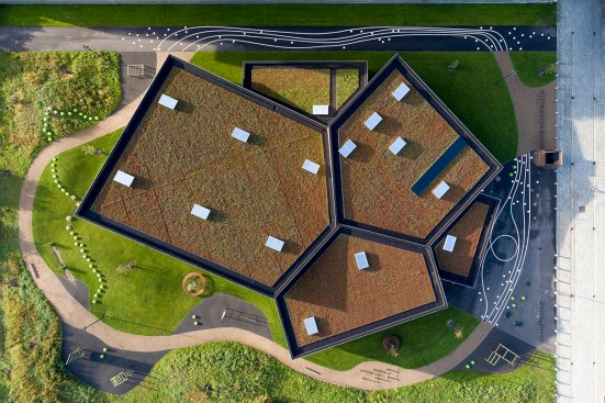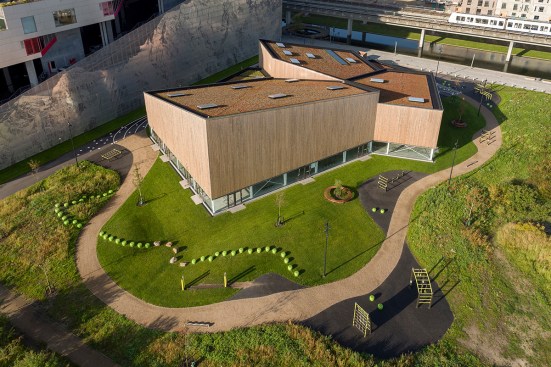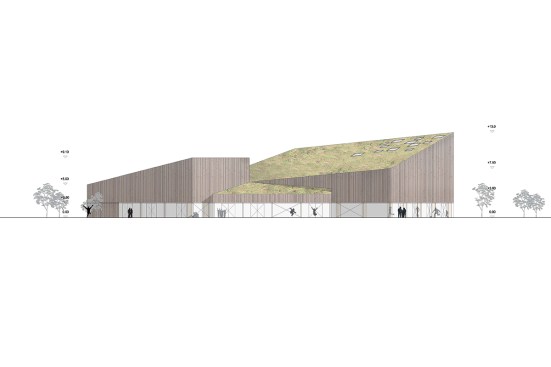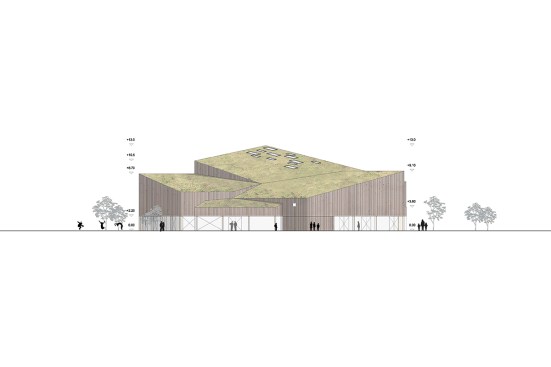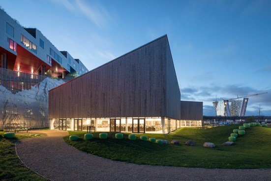 As opposed to the surrounding buildings, the lowest point of the Multi-purpose facility is facing Ørestad Boulevard, and in this way meeting and welcoming the people in the neighborhood on ground level. Furthermore, the building stands out due to its green roof and wooden materials.