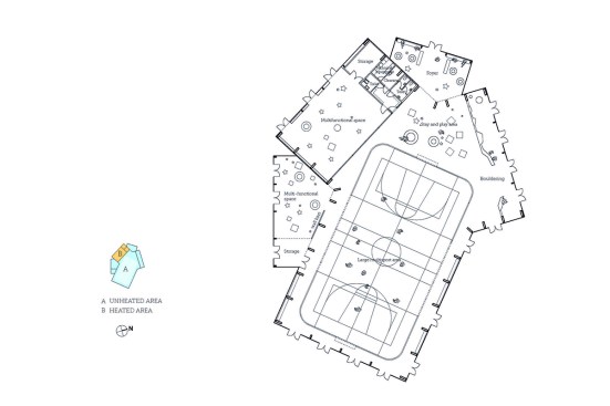 The building is open 24/7 to the public, school classes and local sports clubs and is divided into heated and unheated areas, with the unheated part as the biggest multifunctional spaces for different activities as basketball and floorball and the heated part as a space for dance, yoga, material arts or floor exercises for smaller groups. The building is unstaffed and all activities and events are arranged and held by the users themselves whether organized in groups or private initiatives.