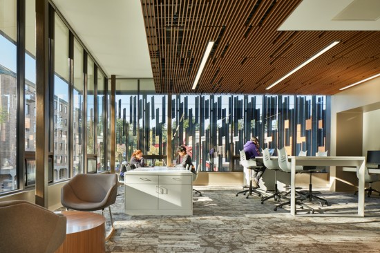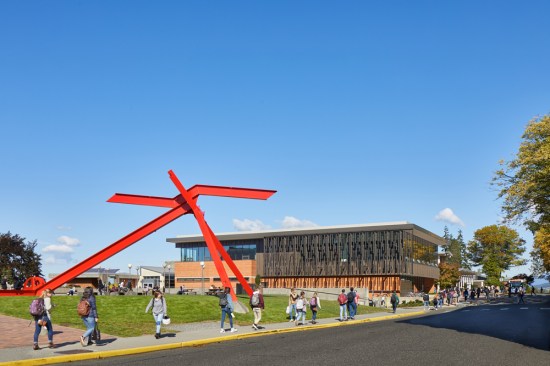The Multicultural Center is a transformational project and new home for the campus ethnic student groups located prominently above the renovated bookstore. Conceived as a sculptural bronze object articulated with a woven skin comprised of profiled metal panel with inserted Z-strips which levitate within the sunscreen. The resulting textured metal façade alludes to the weaving traditions of the local Salish Tribes and “cultural fabric” of the ethnically and culturally diverse student groups. Connecting three buildings, the addition creates a cohesive student union bridging old and new with a welcoming entrance, display of student life activity spaces, and a new mass plywood stair that links lower level student programs to the elevated Multicultural Center.