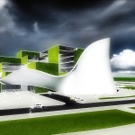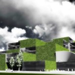 The concept is a set of green cubes packed with sculptural surface as a part of cubes go beyond the area of the main building. Green cubes symbolize the nature and provide optimum microclimate in the area. The second topic is the sculptural surface which symbolizes a paper sheet / the paper is basically the main creative artistic tool by itself for every artist/.