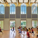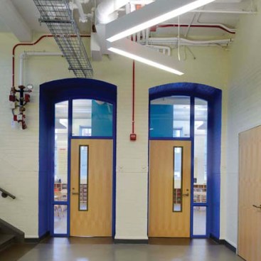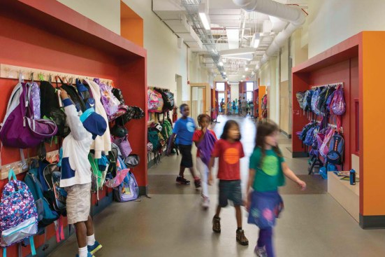 Overhauling the pre-existing, 36,148-square-foot elementary school involved installing all new mechanical systems. Studio 27 took inspiration from the energy efficiency of the building’s original ventilation system, which pulled fresh air through the basement and a series of vertical shafts. The new air-cooled variable refrigerant flow (VRF) system allows for localized climate control and energy savings from not having to push conditioned air around the building. And the old ventilation shafts now serve as one-on-one tutoring niches. The heart of the school is the refurbished, double-height multipurpose space called the “Zócalo” (after the main public square of Mexico City), which combines the functions of auditorium and gymnasium. Positioned just inside the school’s main entrance, it boasts restored round-arched windows, disc-like LED pendants, and better connections to the outdoors thanwere offered by the existing space.