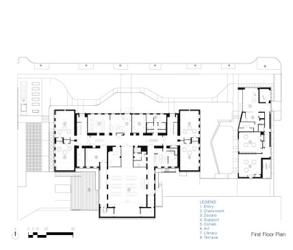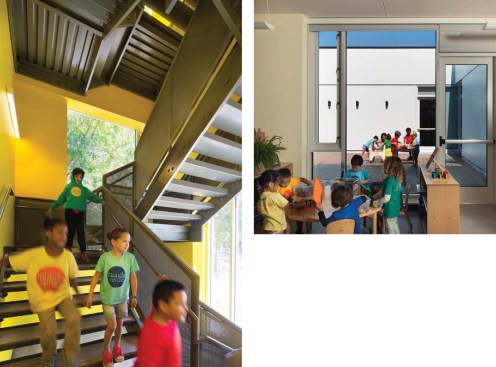 The newly constructed, 10,963-square-foot annex, home of the kindergarten and pre-K programs, also has a Spanish name: la casita, or the small house. It fronts the street, at once addressing the neighborhood and creating a garden court in the space between the new and old structures. “We kept the fences low and the gates wide,” Ray says. The building is certified LEED Platinum and achieves solid performance metrics, but its most popular feature may be the elevated deck overlooking the campus, which the elementary school students are known to relish.