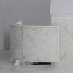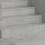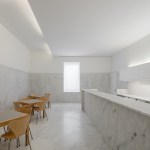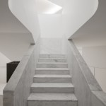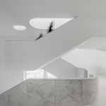 Inside the 23,215-square-foot addition, white gypsum-board walls are finished with a rich gray marble paneling that rises to varying heights on the walls in the lobby, public areas, and circulation spaces. The same stone is used on the floors throughout, and, with impeccable detailing, to line the stairs, balustrades, reception desk, and cafeteria counter. Sculptural gypsum-clad cut-outs in the concrete slabs around the stairs allow light to permeate the lowerlevel exhibition space.