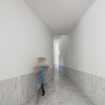 Across the vegetated cloister, and connected via a new shared lobby, is the larger intervention: A low-slung, minimal white volume that houses the new sculpture museum. The cornice line of the old monastery complex defines the height limit for the new structure, whose angular siting is a result of hugging the sloping ground plane. The sculpture museum takes cues from the existing monastery complex with white walls and a terra-cotta-colored ceramic tile roof. As seen from the higher hills of the city, the diagonal roof line blends seamlessly with the rhythm of the historic structures. But the absence of ornamentation, combined with contemporary construction methods—concrete walls are clad in a composite insulation system incorporating high-density mineral wool, finished in a coating of white-painted plaster—bring a decidedly modern aesthetic to the site.