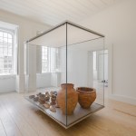 corridor and in gallery spaces that line the east side of the wing. Each gallery features custom glass vitrines, warm wood floors, and revamped lighting beneath white-painted ceilings. The easternmost room was converted to a presentation theater. Minimal, exposed-bulb lighting fixtures run the length of the corridor on the wing’s west flank.