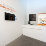 The reception is located on the top of the stairs that arrive from the main entrance. The design is very sober and everything is painted in mate white. On the back of the reception the wall was opened to create a window that looks into the store, so the visitors may have a pick while buying their entrance tickets. There is also a screen that publishes all the messages of the museum´s social media communication.
