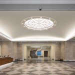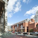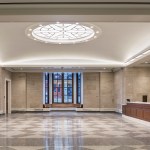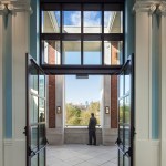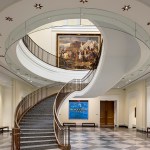 Set amidst buildings of national historical and architectural significance—facing the First Bank of the United States (Samuel Blodgett, 1795), near William Strickland’s Merchant’s Exchange (1834) and the U.S. Custom House (Ritter & Shay, 1934)—the Museum evokes the restrained Classicism that heralded the birth of the Republic. The Museum addresses the corner of Chestnut and Third Streets with a broad plaza and an inviting, bronze-painted domed entrance pavilion set into a stone tympanum. A museum shop and café that opens to the sidewalk enliven Third Street; above, the wall that conceals the galleries is articulated with recessed brick arches housing stone apsidal niches, accented with stone at the spring points and keystones. On Chestnut Street, a bronze-painted bay window flanked by two bas-relief panels depicting John Trumbull’s painting Declaration of Independence offers passersby a view into the entrance rotunda.