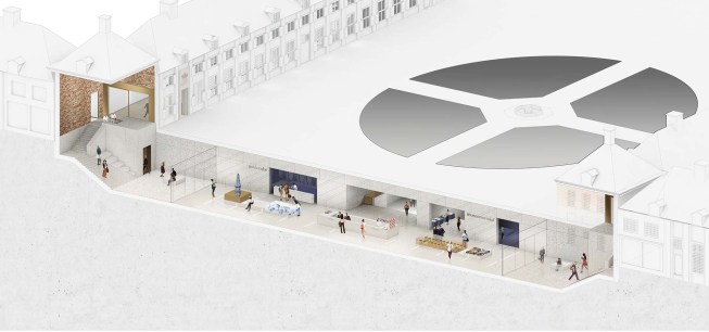 Upon arrival to the palace, visitors will reach the Bassecour where the four grass parterres of the front courtyard will be replaced by four glass surfaces with the exact same measurements. A thin layer of water will flow over the glass – a nod to the fountains and waterworks of the historic gardens. The new glass surfaces will be the only façade of the underground expansion. The entrance pavilions will lead to the light-filled underground entrance area where the ticket and information office, museum shop, and other visitor facilities will be located.