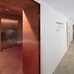 With its sinuous combination of pigmented concrete and the sharp metallic geometry of the balustrades and ceilings, the new circulation space continuous the formal language of its outside appearance and creates a spatial experience in contrast to the bright white rooms of the exhibition – a place intentionally designed as a resting point of reduced sensory experience in between the density of the exhibition.