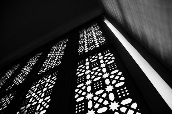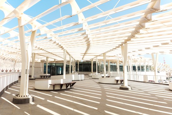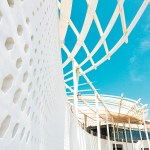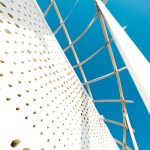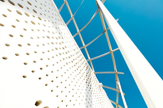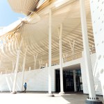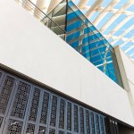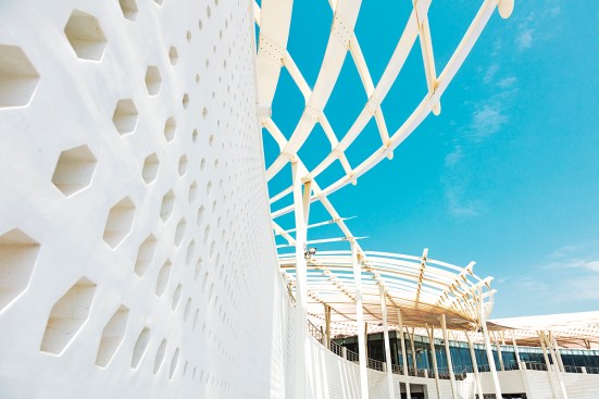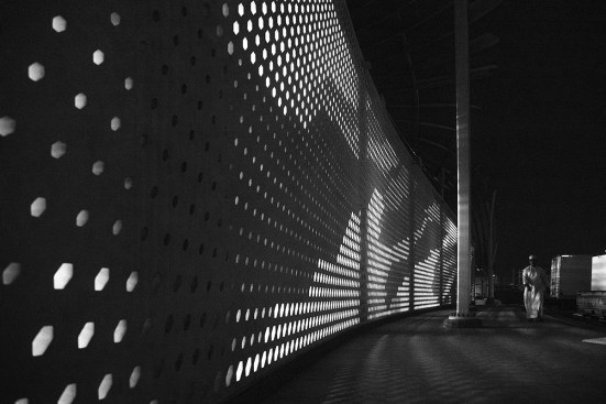 On street level, the new market enhances the public setting by forming a dynamically shaded canopy, organizing the spaces beneath it. The canopy’s form is derived from the sinuous flow of Arabic calligraphy. It follows the logic of a playful movement of light and shadow built from aluminum fins which provide shade, natural ventilation, and an ephemeral appearance. The complexity of the canopy roof contrasts the simple solidity of the concrete structure below it.