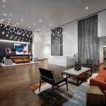 In the lobby, guests are drawn into the space by an undulating light fixture that cascades down to the white marble reception desk. A metal accent running through the dark wood lobby flooring ties the exterior to the interior, while a custom three-dimensional, floor-to-ceiling backlit metal panel screen serves as a focal point near the elevators.