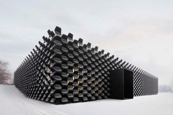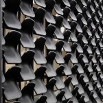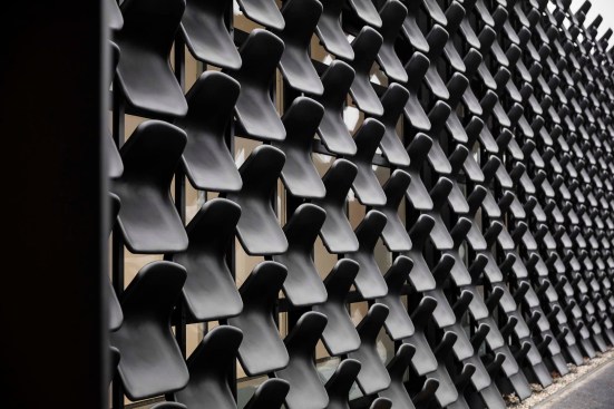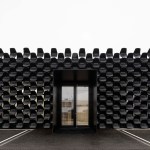 The transformation of a former car show room on the outskirts of a housing estate into a site of the MY DVA group, whose focus is the production of office, school and metal furniture, represents another finished structure of the young architecture firm CHYBIK + KRISTOF Architects & Urban Designers from Brno, Czech Republic. The former single-story building of poor aesthetic quality is turned into a building with a new, easily remembered façade composed of more than 900 black plastic seats. The façade is conceived abstractly, functioning also as a banner advertisement for the firm itself. After finishing a simple refurbishment of its interior, a new flexible showroom was created presenting the individual segments of the firm ́s production in specific, thematically arranged settings.