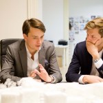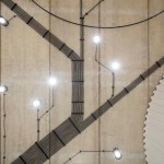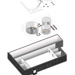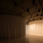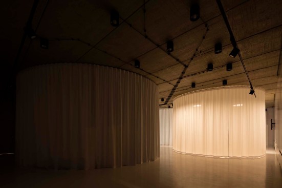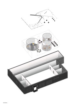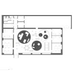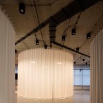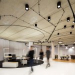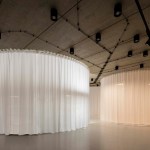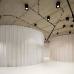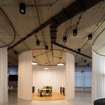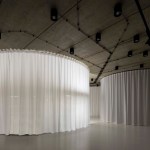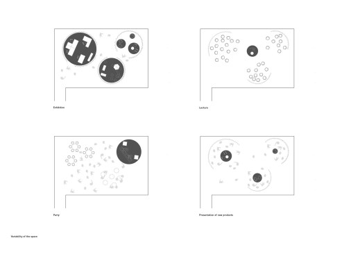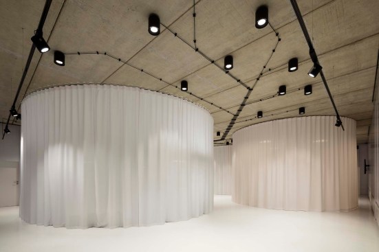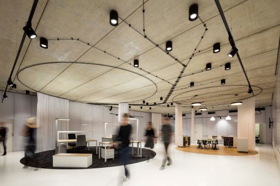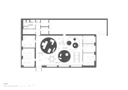 “What we used is a basic form of an interior chair called Vicenza, which the supplier delivers on a regular basis. In this case, however, we used black granulate for the outdoors because it is resistant to different weather conditions, especially UV light,ˮ the architects describe. The individual seats are fixed on a structure made from steel sections fixed on the façade. In case of mechanical damage, it is possible to change out each piece for a new one, and even cleaning the façade can be done easily once or twice a year by a high-pressure cleaner. The concept of the interior represents the second level of the project and consists of two parts: a showroom and offices with a background for the employers. The inside of the building was demolished. A presentation space for the showroom was created by enlarging the former entrance hall at the center of the layout and is demarcated by polycarbonate partitions. The floor is unified by means of white screed, on the ceiling remain former fair faced concrete panels and all the new wirings are exposed. Three circular galleries are embedded into this newly created space, representing three different segments of production – school furniture, office furniture and design pieces. The circular cutouts are demarcated by white textile curtains the full height of the space that can be closed or let open. Interiors of the cutouts represent three different settings where the flooring material, means of lighting and the color of the light itself are aimed to correspond with the natural setting that the furniture is intended for. The interstices can be filled with various products or pieces of art, and they can be used as a common room for the employees or for get-togethers with clients. The whole space is based on the principle of a gallery which can be easily adjusted according to the actual needs.