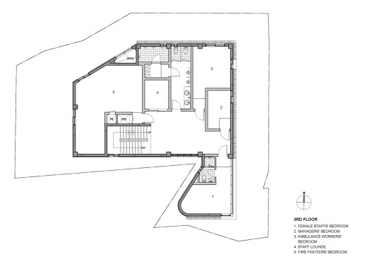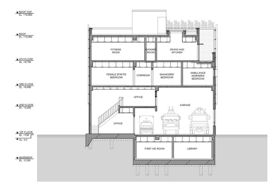 Located in the residential area with large apartment complex, it faces 6-lane road in the front and retaining wall at the back from Jungnang Stream. The garage for three fire vehicles and the main office with an abundance of windows are positioned in a row directly to the main road. It helps effective civil service and open and active attitude as an essential public infrastructure. Programs on the upper floors are nearby vertical circulation and most bedrooms are at the back of the building for more intimacy.