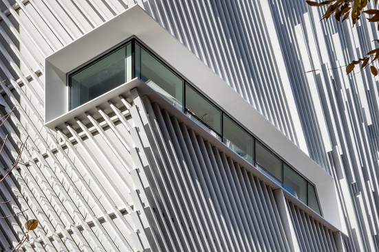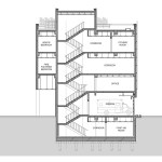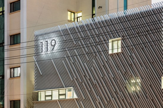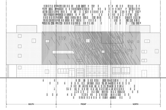 The louvers in elevation symbolize quick mobilization of fire trucks. The gradient pattern generated combined by two louver types with different depth (100mm and 200mm) is employed to maximize this concept. This skin can provide functional advantage blocking the direct sunlight, but gaining enough lighting and openness as well as conceptual idea. The windows with or without covered louvers based on inner programs give depth and variation in the elevation. While many fire stations stand out the most visually in urban context to symbolize their identity by red color and bold signage, this new station tries to deal with it by the building itself.