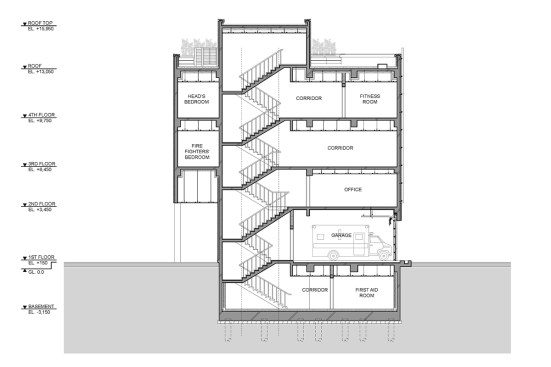 Previous fire station in Myeonmok area could not handle fire-service demand efficiently with its old facilities. New proposed fire station improves the working condition and provides locals the sense of firefighting safety by unique architectural symbol. Program layout for short circulation and open offices increases work efficiency and firefighters’ mobilization for emergency response. Its distinct image of elevation will suggest new identity of fire station as public building.