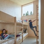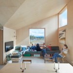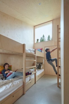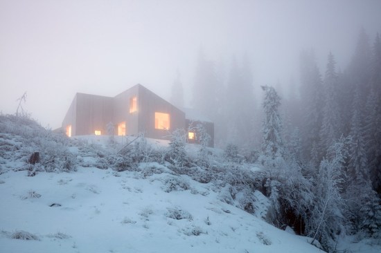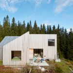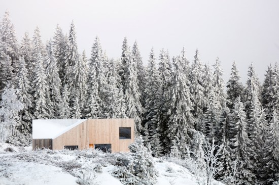 In this beautifully crafted and understated example of a Scandinavian holiday home, the four-arm pinwheel geometry suits the compact scale and mountainous site. Inside, plywood walls and ceiling, simple clerestories, and sliding glass doors distribute light dramatically through each arm across the day. The building is sited for wind and views, making for a delightful design synergy.