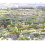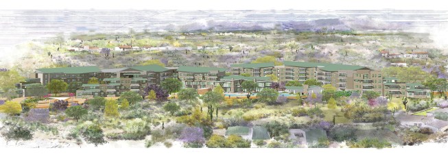Recently, Rocky Berg, principal and director of senior living business development at three: living architecture, spoke at The Greystone Event about upcoming trends taking place within the senior living industry. He focused on how he bridges the gap between generations in a master-planned mixed-use development, makes design decisions that architecturally blend an expansion with an existing property and uses the local flavor and natural environment in the design. While speaking, he explained that if an expansion is not an option for a community, an operator may look into building a sister community located on a different site or in another city. In Tucson, Arizona, the operators of highly successful La Posada senior living community decided to do just that. Backed by an outstanding public reputation based on 30 years of service in Green Valley, south of Tucson, the La Posada leadership is leveraging its established knowledge and expertise to develop a new community in the Oro Valley, north of Tucson. Nakoma Sky will further diversify and expand the market and widen revenue potential in one of the nation’s most sought-after active aging hotspots. Nakoma Sky’s site is nestled in between two mountain ranges on an untouched natural desert landscape, so Koerner and his design team have thoughtfully “nested” the multi-storied building into the undulating topography. The goal is to bring the outside in and make sure that residents have the feeling of being outdoors while enjoying the comforts of their own home. The team blurred the lines between inside and out, cross-pollinating materials, using an abundance of glass and designing around numerous intimate outdoor living spaces. Residents will move freely between inside and outside, so Nakoma Sky has a very open, flexible design concept. The swimming pool was organically designed with an infinity edge that is used for swimming during the day but transforms into art at sunset, reflecting the mountains and the floating fire pots.